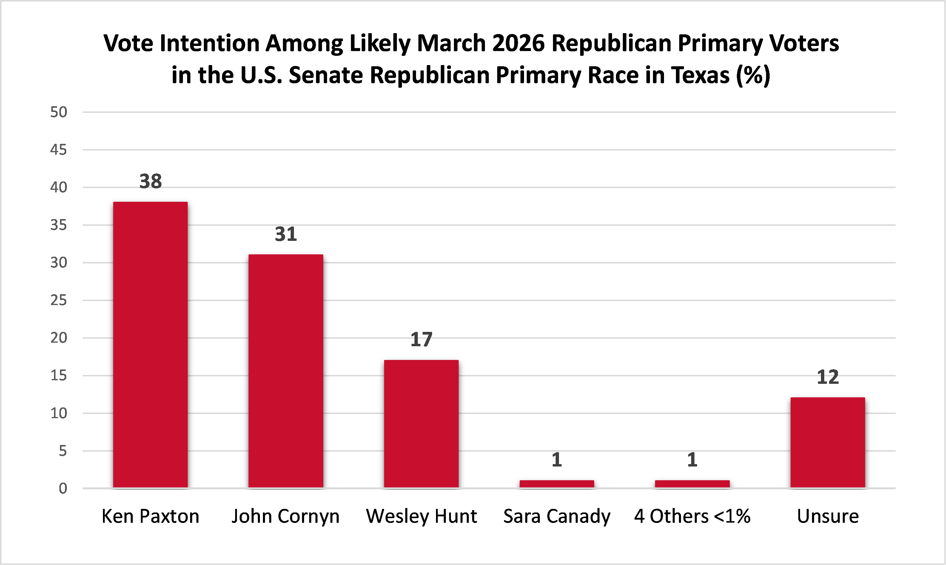 In the March 2026 Republican U.S. Senate primary in Texas, 38% of likely voters intend to vote for Ken Paxton, 31% for John Cornyn, 17% for Wesley Hunt and 2% for other candidates, with 12% undecided.