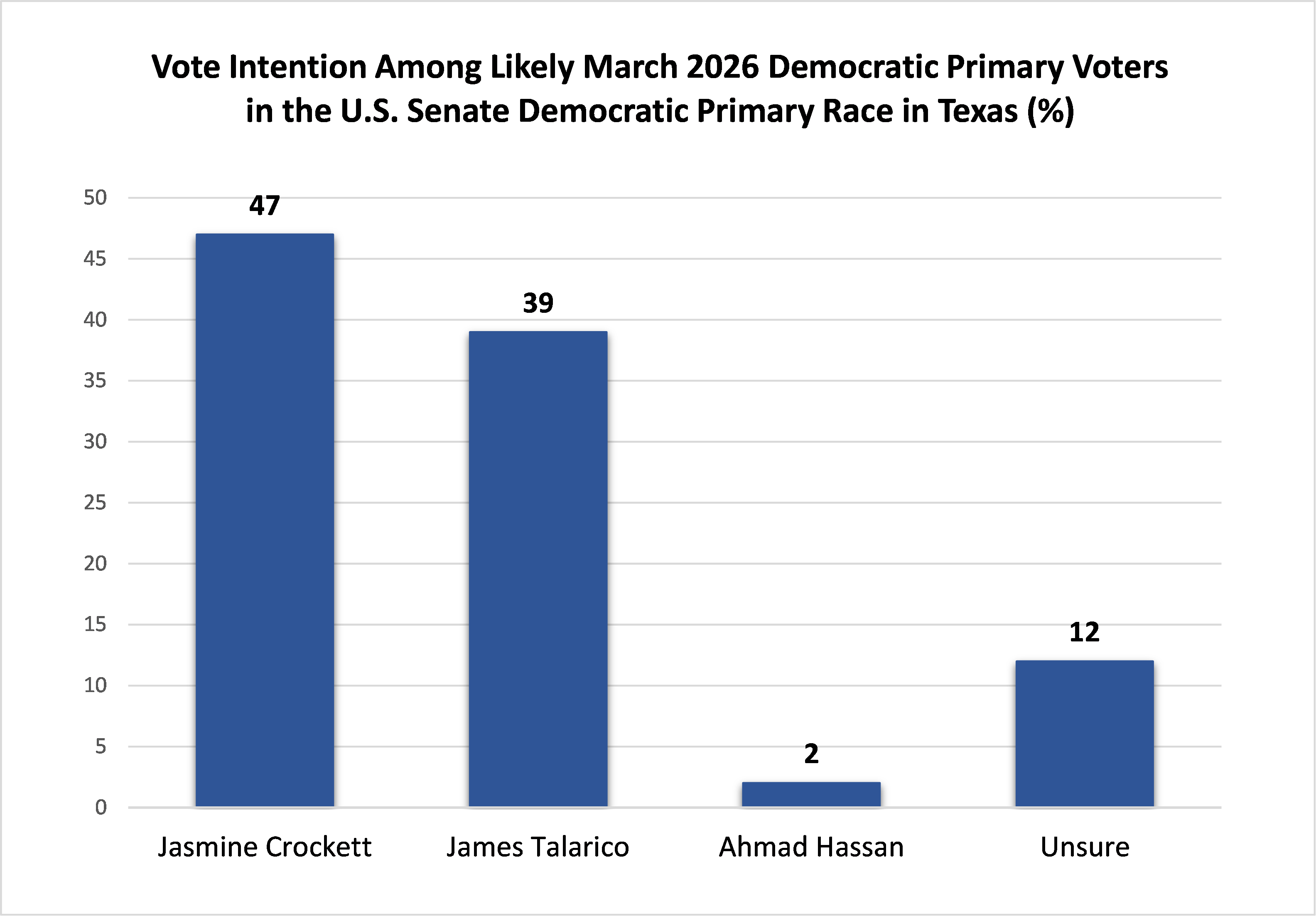 In the March 2026 Democratic U.S. Senate primary in Texas, Jasmine Crockett leads with 47%, 8 percentage points greater than James Talarico’s 39%, with Ahmad Hassan receiving the support of 2% of likely voters and 12% unsure of how they would vote in this contest.