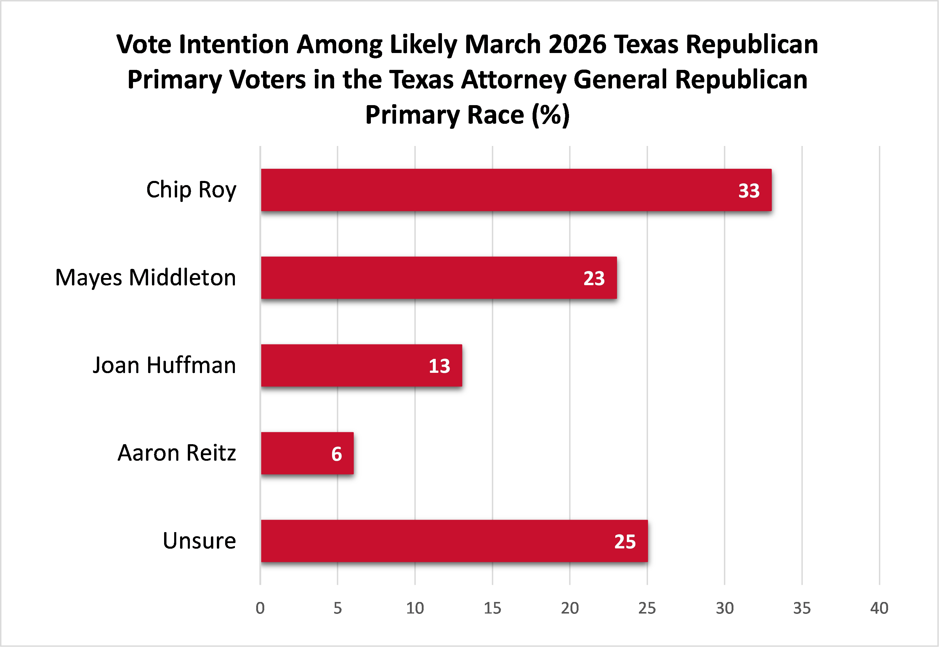In the Republican nomination for Texas Attorney General, Chip Roy leads with 33% of the vote, followed by Mayes Middleton, 23%; Joan Huffman, 13%; and Aaron Reitz, 6%. 25% are unsure.