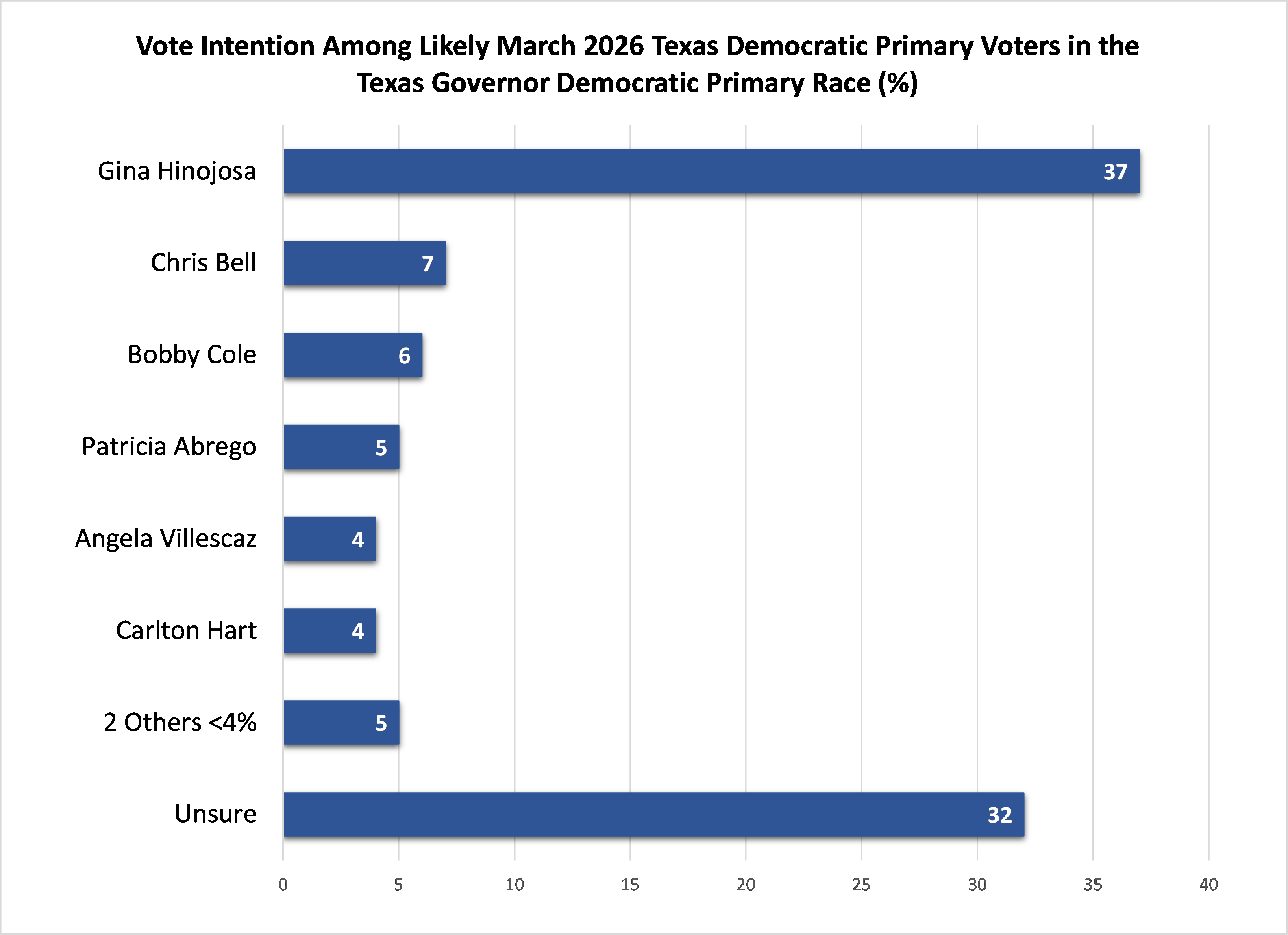 Gina Hinojosa leads with 37% in the Democratic primary for governor, followed by Chris Bell (7%) and Bobby Cole (6%). 32% are unsure.