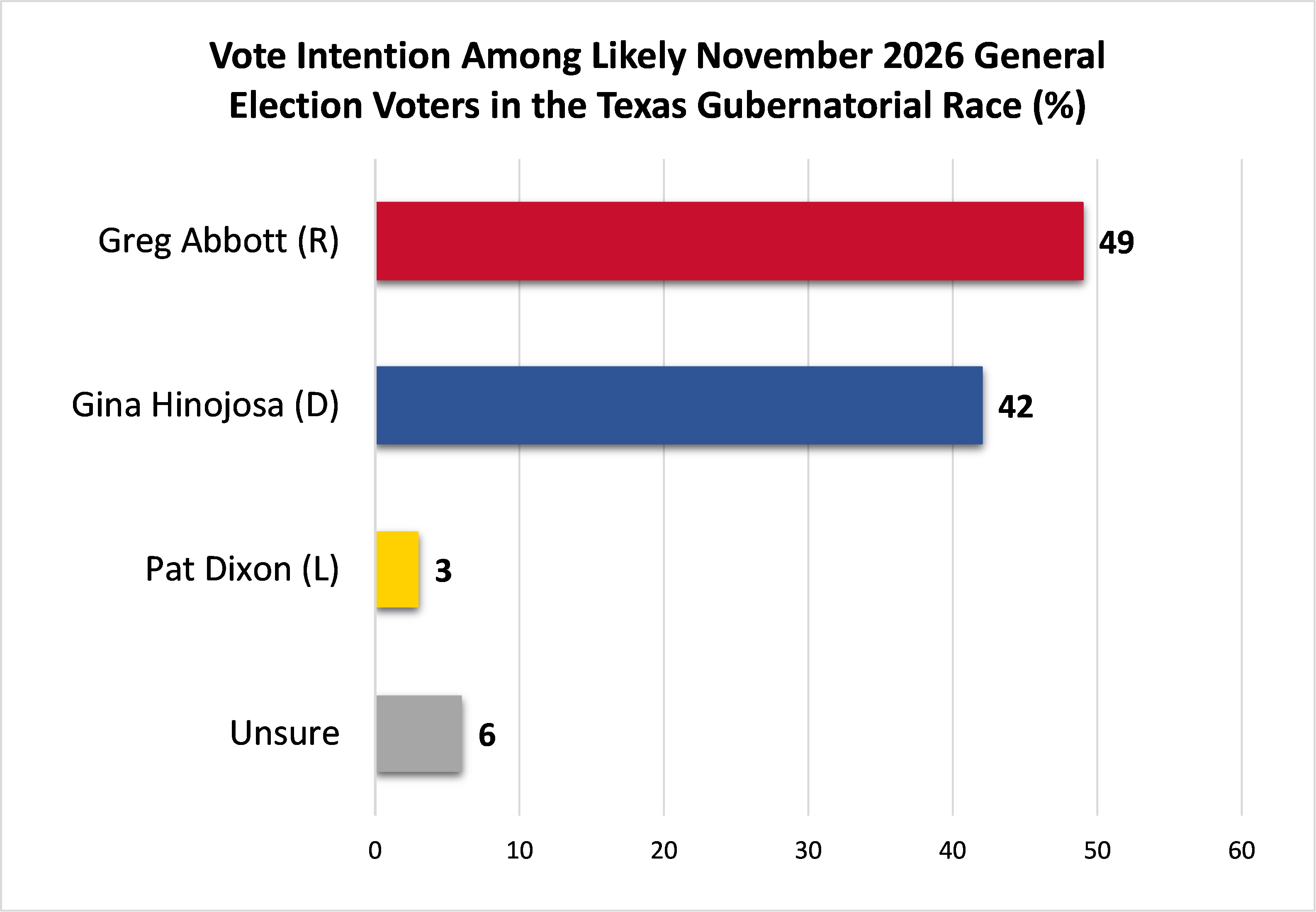 In a potential gubernatorial matchup in the General Election, Gov. Greg Abbott leads Gina Hinojosa, 49% to 42%.