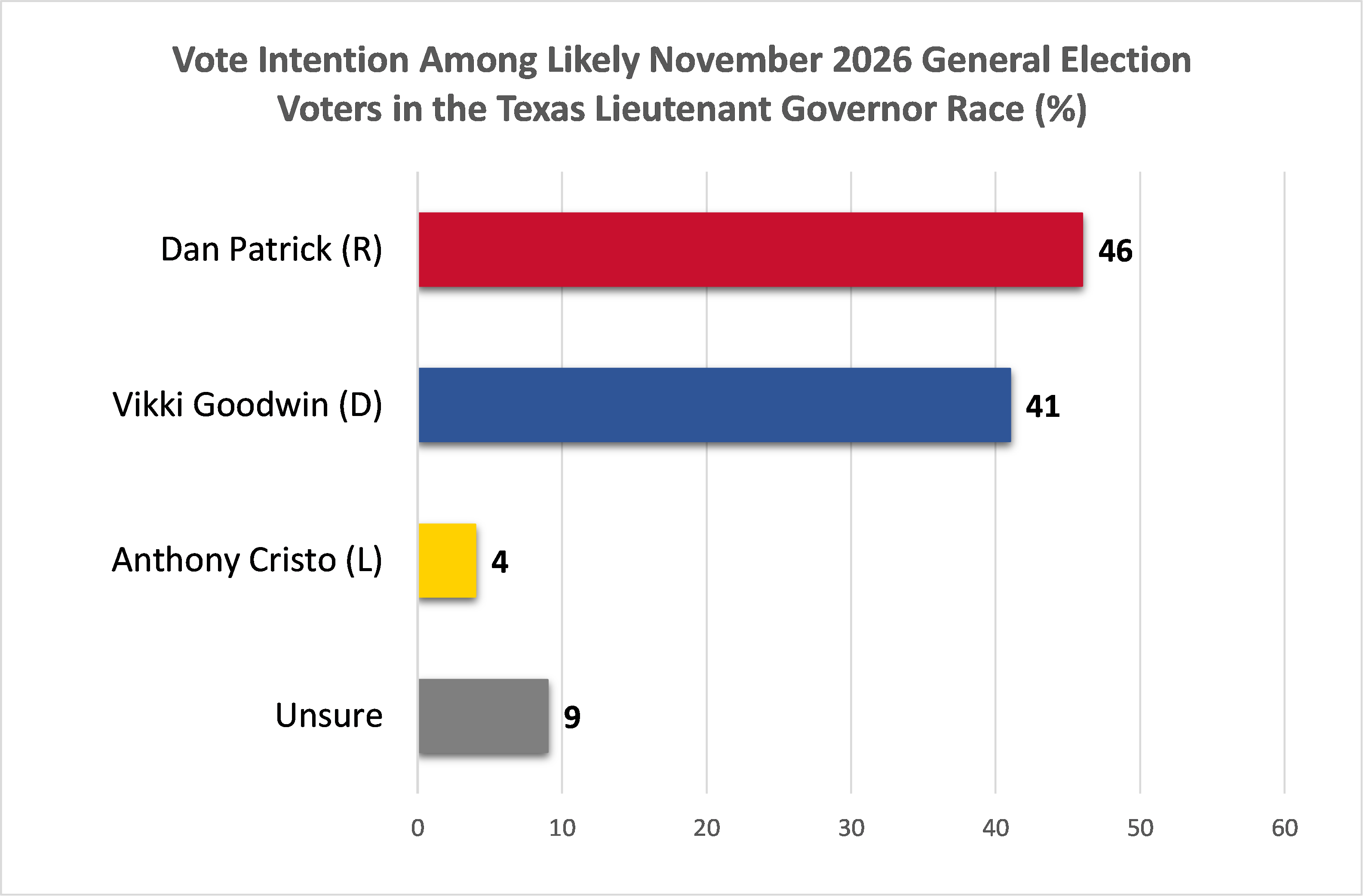 In a potential November contest for lieutenant governor, Lt. Gov. Dan Patrick leads Vicki Goodwin, 46% to 41%.