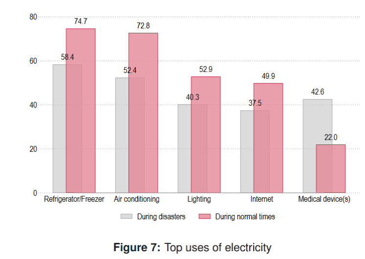 - Energy use priorities: During extreme weather, the top electricity needs include powering refrigeration systems (58%), air conditioning (52%) and medical devices (43%).