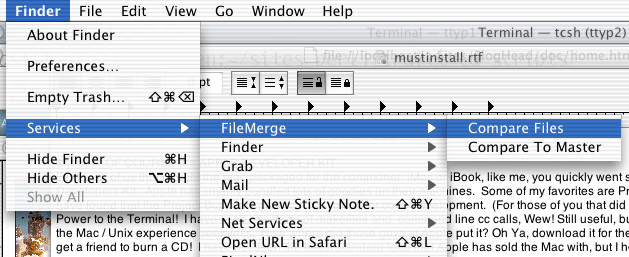 The other core program that I use a lot is File Merge. It is accessible from the finder services menu: