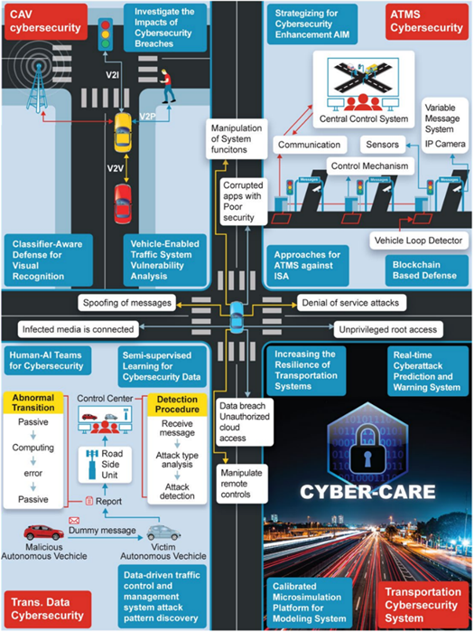 Next-Generation Transportation Cybersecurity Systems - Protecting next-generation transportation cybersecurity systems is complicated due to their reliance on multiple sub-systems, including sensors, weather stations, and smart vehicle networks. CYBER-CARE will address this problem and create reliable, next-generation transportation cybersecurity systems in various ways: