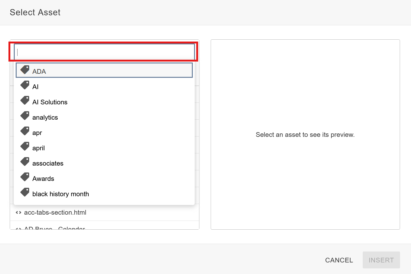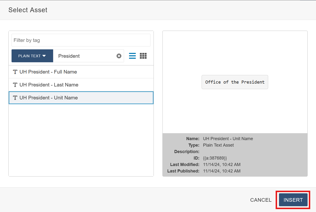 Insert Asset: Once you have selected your Asset, click the blue Insert button to drop it in.