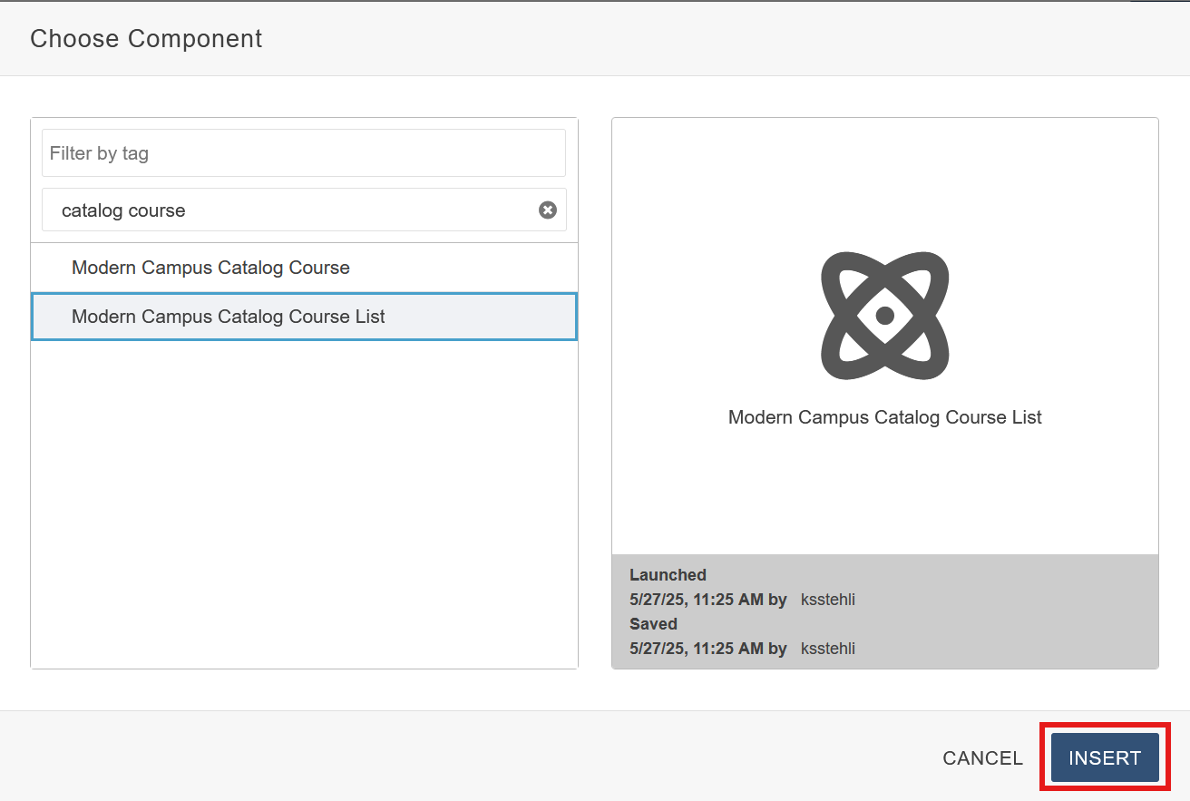 Insert Component: Once you have selected your Component, click the blue Insert button to drop it in.
