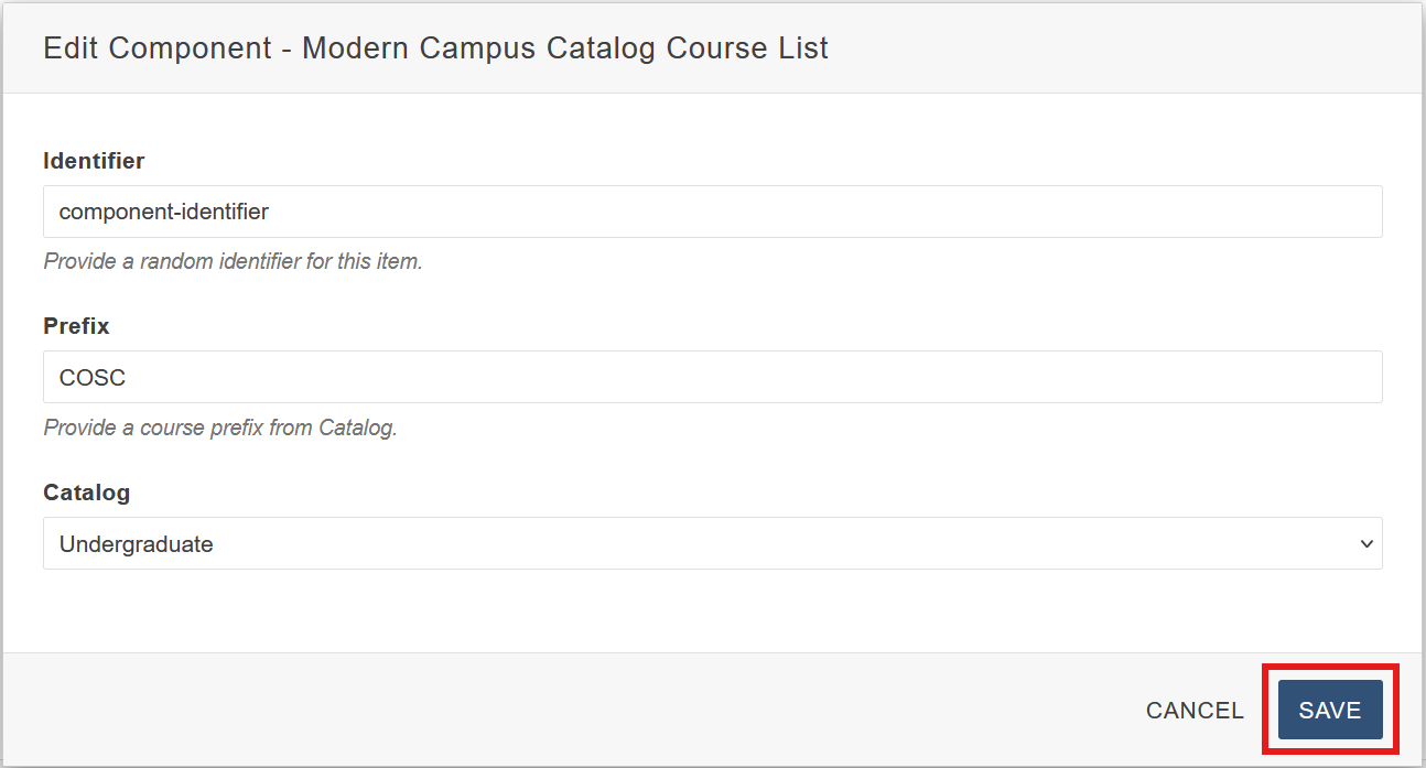 Component Form: Before the Component is dropped it, a form will pop up for the user to fill in. Each Component will have its own form specific to that Component. Once all required fields are filled in, click the blue Save button to drop the Component in.