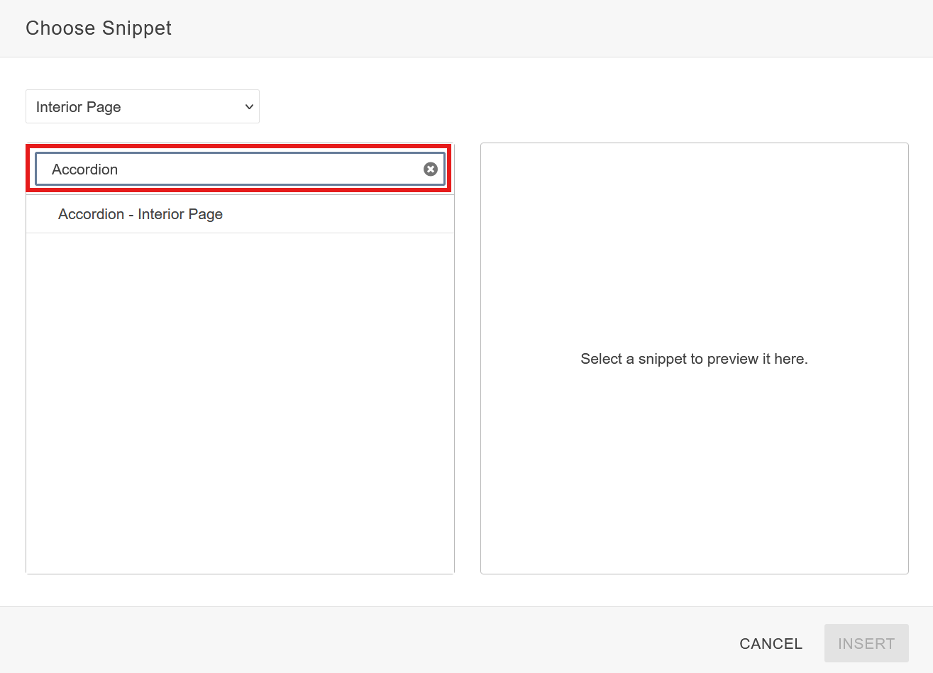 Insert Snippet: Once you have selected your Snippet, click the blue Insert button to drop it in.