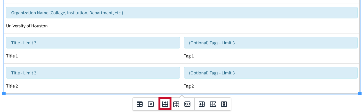 Although Modern Campus uses the term “insert,” a more accurate description in the case of rows would be “duplicate.” When you insert a row in the table editor, it duplicates the structure of the currently selected field (or row). The new row—whether inserted above or below—mirrors the layout and field types of the selected one, allowing for consistent formatting and easier data entry. This behavior ensures that the inserted row aligns with the table's existing structure without requiring manual configuration.