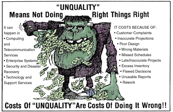 To overcome the notion that my area is O.K., it is the other guy who needs to change, consider the following: "The failure over the years to account for the impact of errors, rework and false economics on a system or service can be devastating in unknowable ways. The good thing is that something can be done about it." Richie, Mark L. Quality Management for Educational Technology Services. Washington, DC.: Association for Educational Communications and Technology, 1994. |