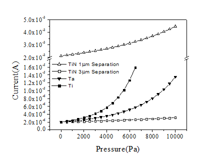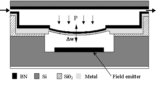In our approach and in contrast to currently available piezoelectric, capacitive and piezoresistive pressure sensors, we are developing field emission based devices that have the advantage of a particularly wide dynamic pressure range using a single device. We optimized the field emission properties of BN layers deposited by ion beam assisted thermal evaporation, developed wet and dry processing methods and fabrication flow diagrams for a field emission pressure device. To avoid expensive process runs and achieve optimized designs for our sensors, extensive modeling and simulation studies were undertaken using commercially available COMSOL software. Of the materials investigated, TiN seems to have the most desirable membrane characteristics with respect to linearity and dynamic range. Funding for this project is continuing through a private company and the UH team is in the final stage of fabricating both electrical and mechanical parts of the sensor. These are specifically engineered nitride–based (BN, CN) cold cathodes and TiN sensing membranes.