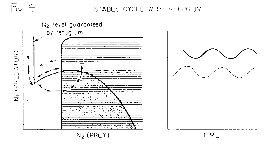 In this case prey have refuge where predators do not have access. Thus, any perturbation that destablizes the cycle can be restored by immigration.