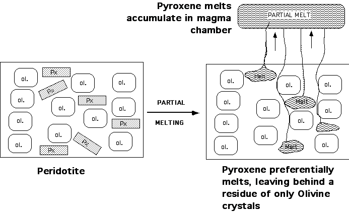 1. Rocks are composed of a mixture of minerals. Not all minerals melt at the same temperature. For instance, a peridotite is an ultramafic rock composed of olivine and pyroxene. If we were to gradually raise the temperature of the rock, wed eventually reach a temperature in which the pyroxenes began to melt, whereas the olivines would remain solid. We would have to raise the rock temperature higher in order to melt the olivine.