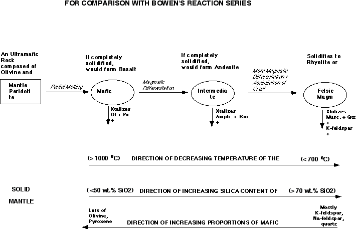 (a) Discontinuous Reaction Series: Different minerals crystallize at different temperatures. An earlier formed mineral may react with the magma and be converted to the next mineral in the series (e.g. olivine to pyroxene).