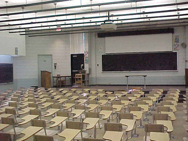 UH large classrooms tend to be rather dreary places. Many are long rectangular boxes with poor lighting. The posters on the wall are commercial advertizements which have nothing to do with academics.