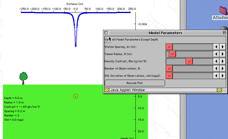 The lower, green part of the applet shows the conditions of the model. The tunnel is represented by the red circle. When you click on the circle and it moves up and down. The Model Parameters window can be moved out of the way. Set Station Spacing, Number of Stations, and Std. Deviation of the Observations slider bars all the way to the left (this sets those conditions at the lowest possible values.