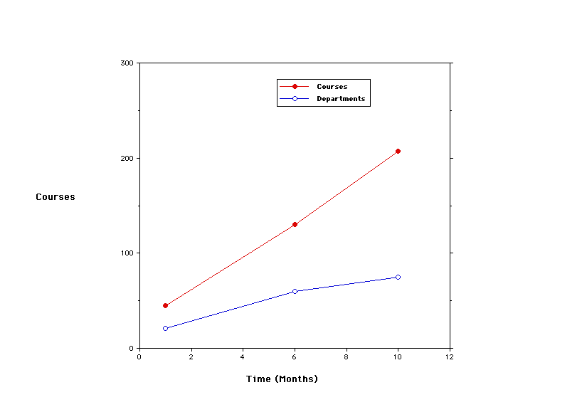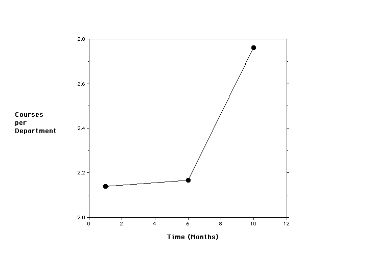 No attempt was made to identify the author(s) of the course home pages, but it was noted frequently that the same individual was responsible for more than one page at his/her university. For example, the two contributions from the University of Houston and the three from Dekalb represent one individual per department. Regardless, a relatively small number of faculty appear to be responsible for pages now published on WWW. Although only three surveys have been completed in about a years time, (Figure 2) the growth rate is slightly greater for courses than for departments as the same individuals develop WWW resources for several of the courses that they teach. A plot of the ratio of courses per department versus time(Figure 2) is approaching 3 courses per department as compared with about 2 courses per department a year ago.