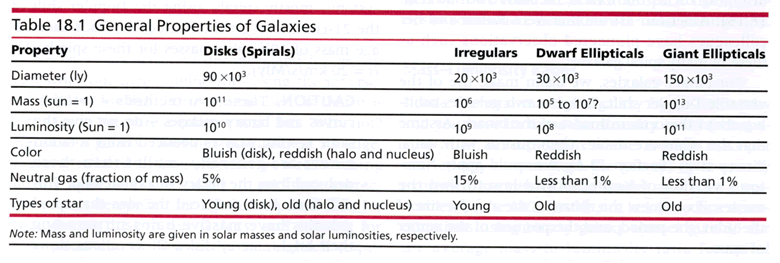 General properties of galaxies (spiral, elliptical and irregular galaxies. Table)
