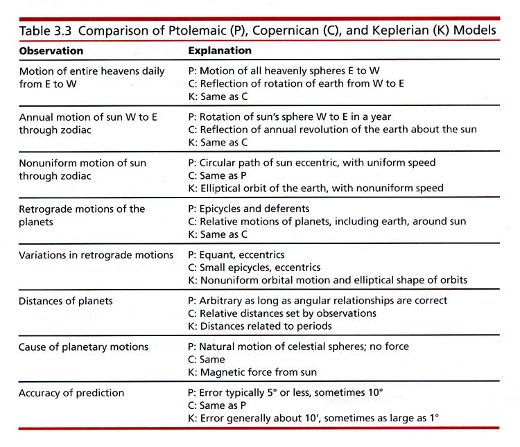 Understand the comparison of Cosmological models according to Ptolemy, Copernicus and Kepler (Summaries 4-2 to 4-4 in Seeds p.72, or this table)