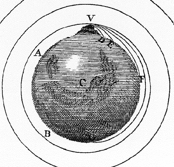 Newton's apple: an apple and the moon both follow same universal law of gravity (Newton's original orbit drawing) or Chaisson Fig2.27