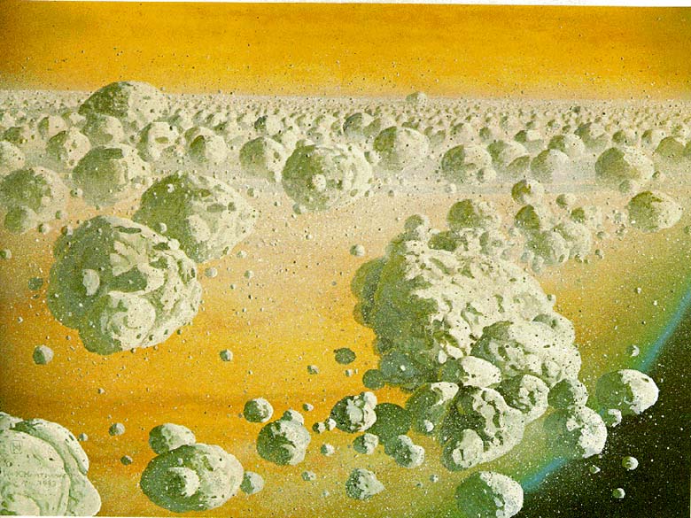 Augmented by Condensation Theory which explains why the bodies are divided into Terrestrial and Jovian, etc. Planets can only form out of material capable of solidifying at each radius from hot center; e.g., heavy rock could withstand close distances, but not ice; conversely, cool light gas can condense at further distances from center.