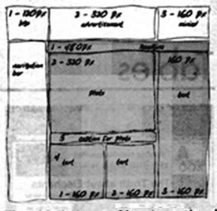 | The main outer table has three columns and two rows. (The second row is the navigation bar and the cell that contains the inner table.) The inner (shaded) table has three columns and four rows. |